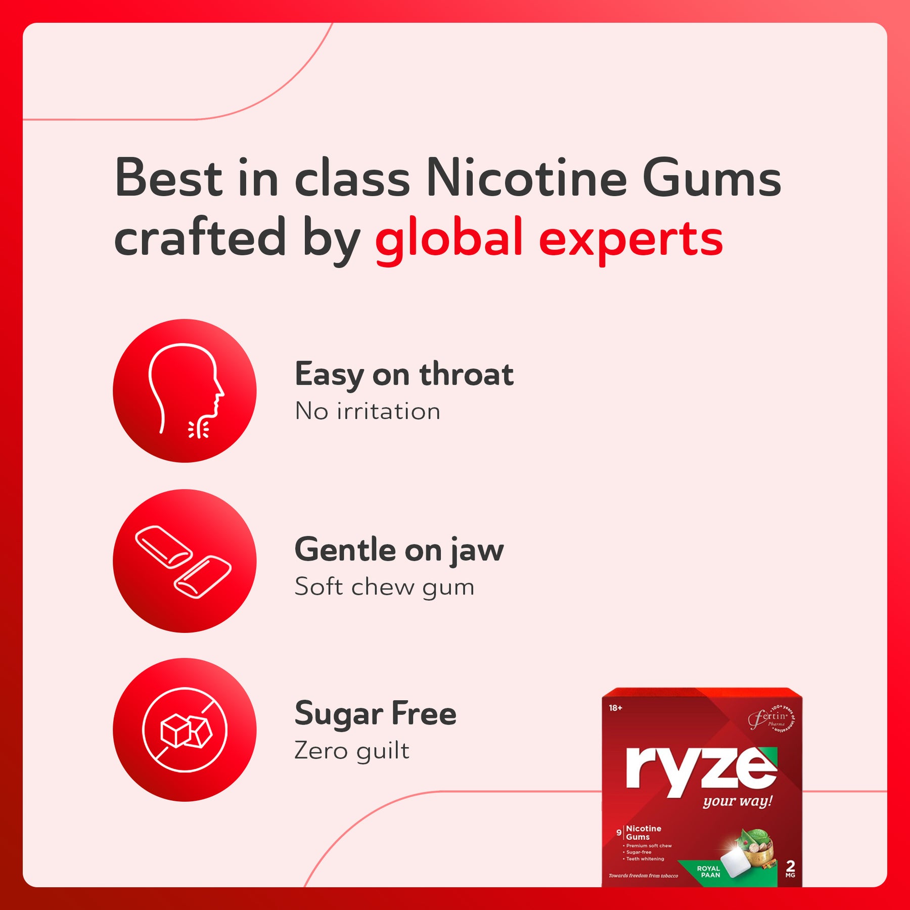 RYZE nicotine gum is only for adults who smoke or chew tobacco and are taking a step towards quitting it completely, as RYZE nicotine gums reduce withdrawal symptoms including nicotine cravings associated to quitting smoking or chewing tobacco. They can be used as part of a tobacco reduction strategy by smokers and chewers who are not ready to stop smoking abruptly, as a step towards quitting completely.