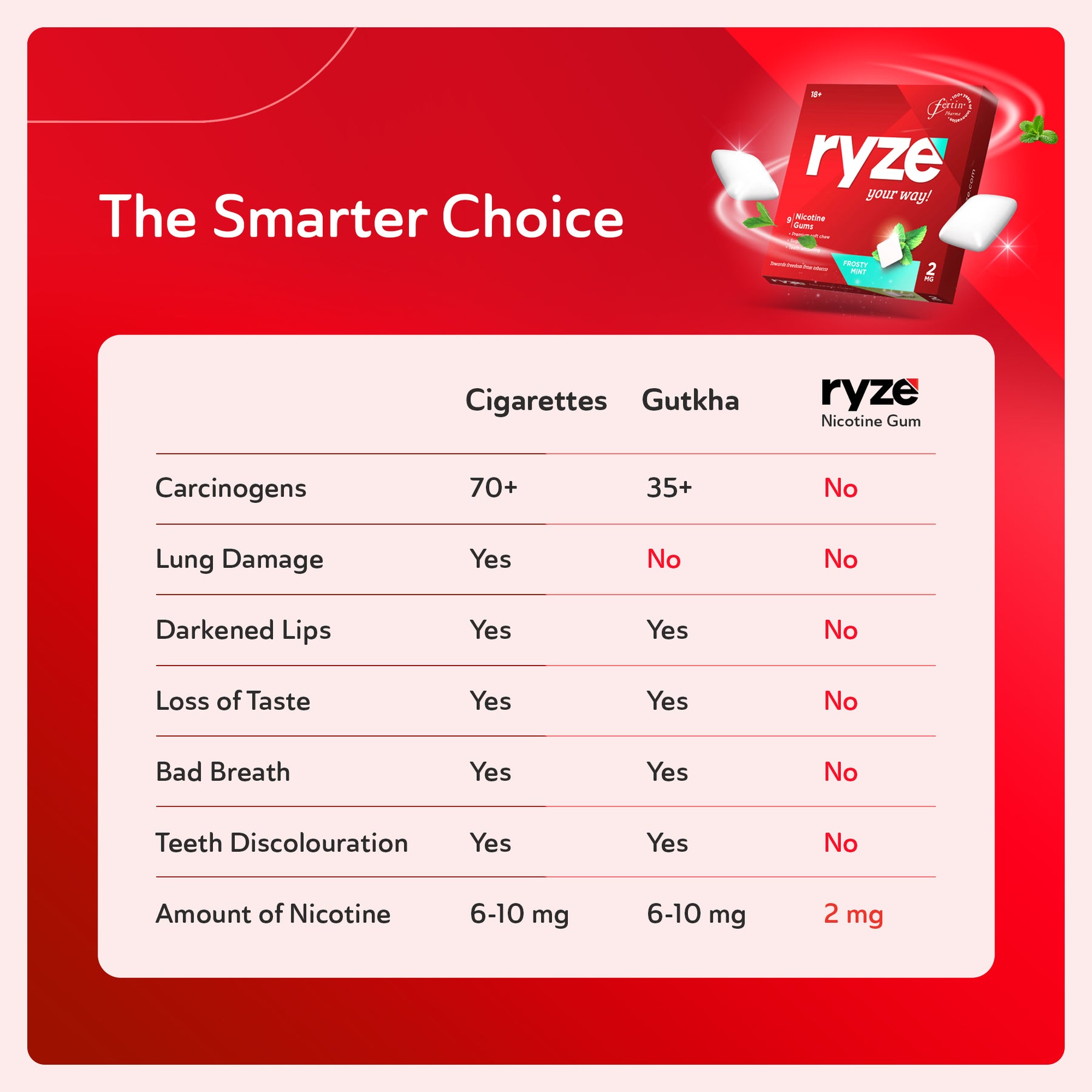 RYZE nicotine gum is currently available in 6 flavours: Frosty Mint, Pudina punch (Pudina), Fruit Blast, Fresh Fennel (Saunf), and Royal Paan, Pan Masala. But stay tuned as there are more and more exciting flavours coming up soon!!